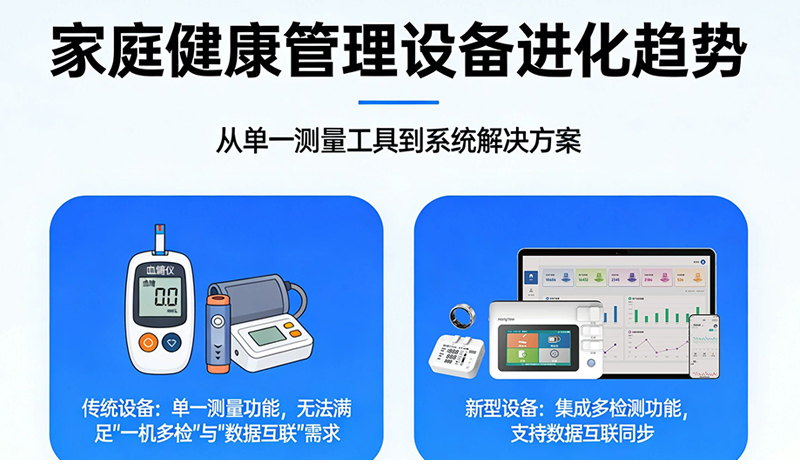 家庭健康需求已从单一的“测量”升级为系统的“管理”。传统的血糖仪、血压计难以满足用户对“一机多检”和“数据互联”的迫切需求。市场数据显示,集成化、智能化的家用健康设备正成为新的消费热点,这标志着赛道正从工具市场向解决方案市场进化。