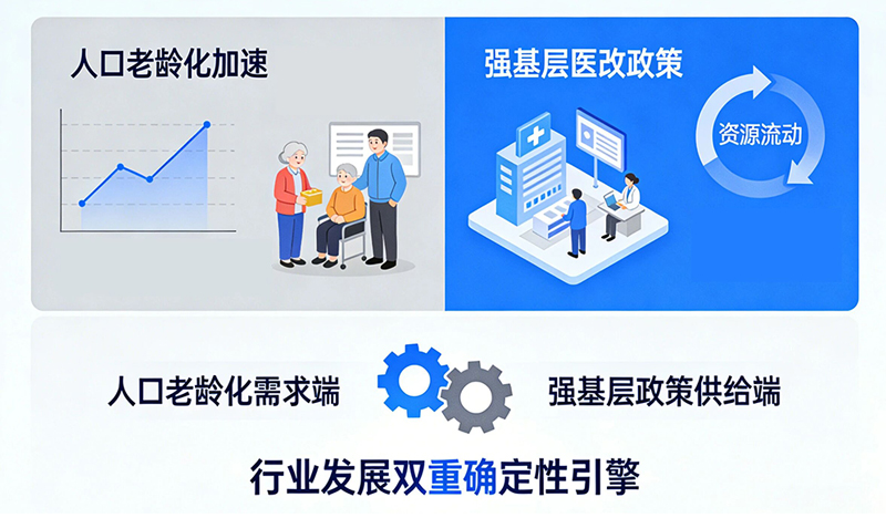 中国快速的人口老龄化,正催生庞大的家庭健康管理刚需。与此同时,国家“强基层”的医改政策明确,大量资源正涌入基层医疗体系,旨在筑牢国民健康“网底”。这构成了行业发展的双重确定性引擎。