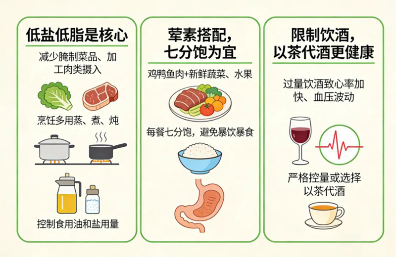 3、限制饮酒,以茶代酒更健康:过量饮酒会导致心率加快、血压波动,建议严格控制饮酒量,或选择以茶代酒,情谊不减。