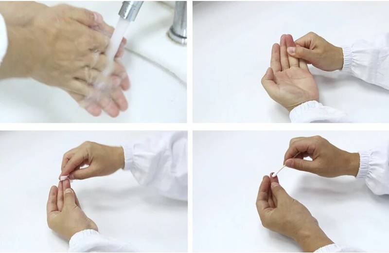 3、使用医用棉签擦去第一滴血,适度轻压采血部位周边,请一次收集足量的血样(充盈、饱满的绿豆大小的血滴)后再靠近试纸加样。