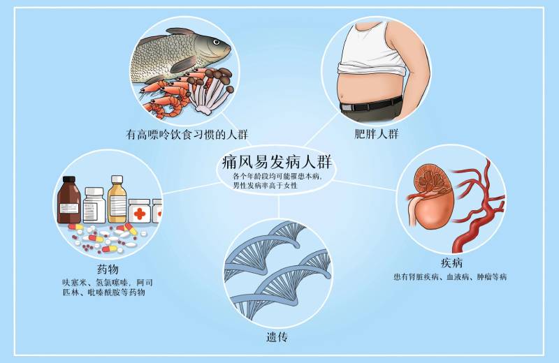 大量饮酒,会使痛风的发病风险增加,高果糖的饮料、高嘌呤饮食(动物内脏、海鲜、肉汤等)、受冷、劳累和剧烈运动都会导致血尿酸升高,引起痛风发作。因此,要控制酒和含糖饮料的摄入,不要大鱼大肉,要均衡饮食,荤素搭配;适量运动,不要过度劳累;杜绝诱发因素,防患于未然。