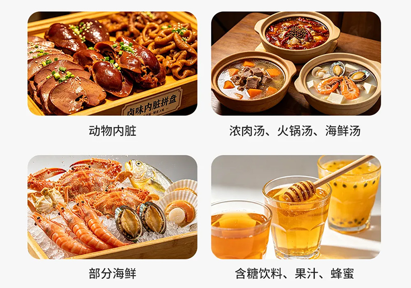 含糖饮料、果汁、蜂蜜(果糖促进尿酸生成)